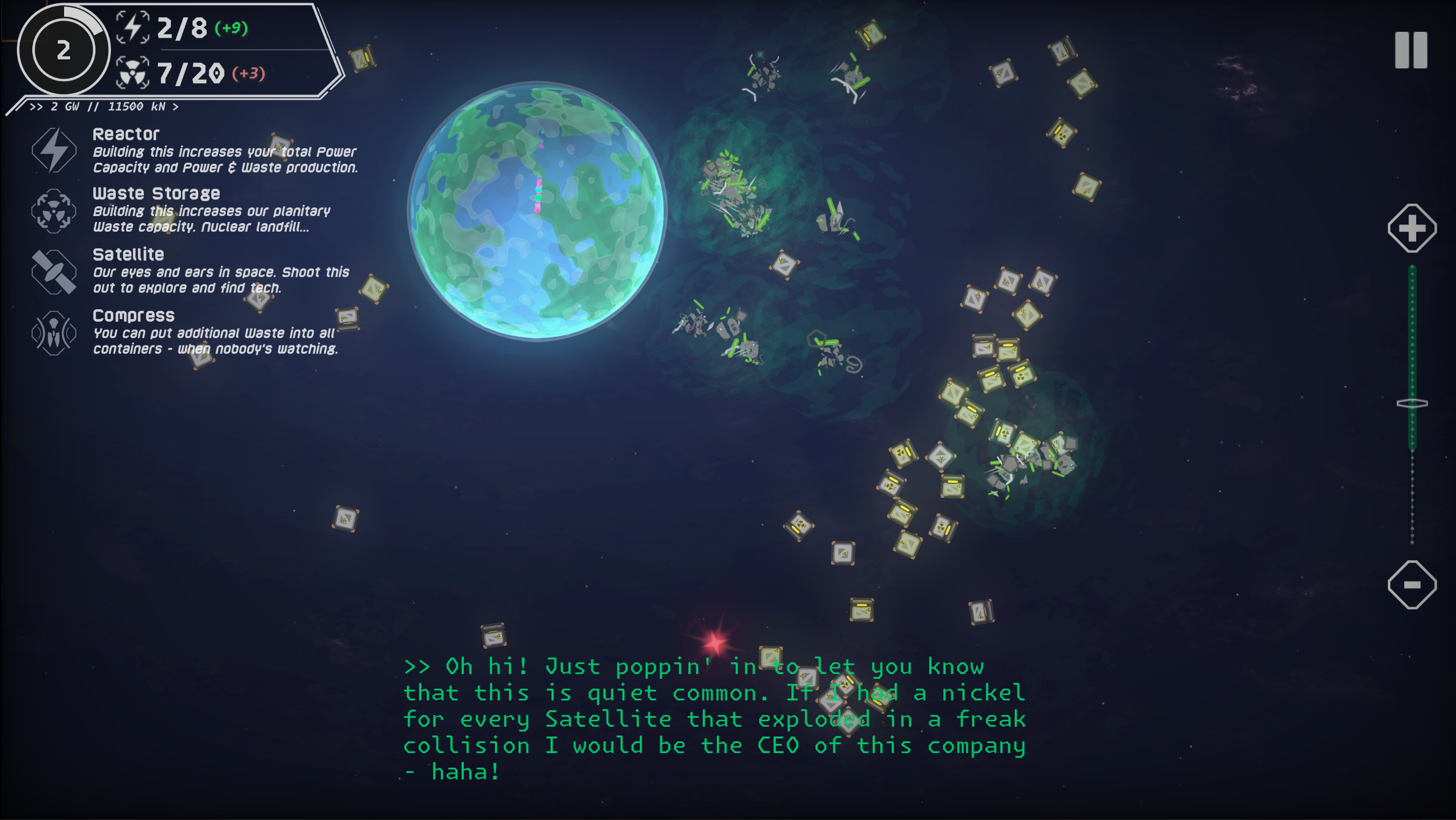 You got a simple task, fellow Waste Management Expert: Don't get us all drowned in nuclear waste! Produce power, reach goals, explore space and remember to shoot that waste up into orbit.